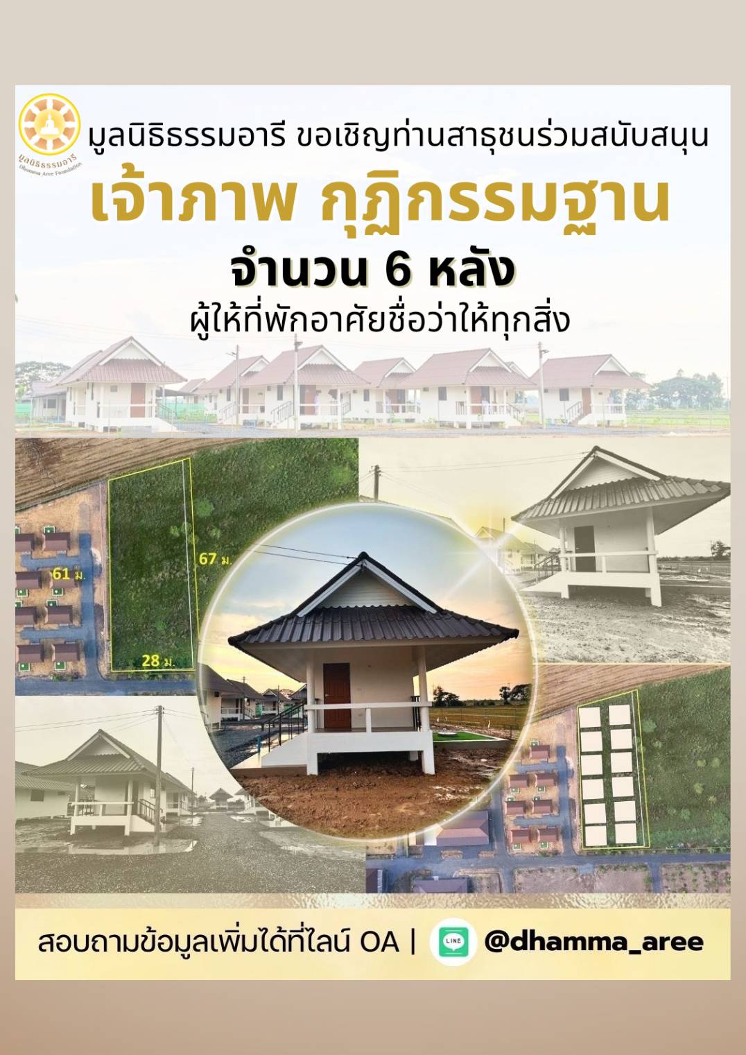 มูลนิธิธรรมอารี ขออนุโมทนากับผู้มีจิตศรัทธาที่ร่วมสร้างกุฏิกรรมฐาน ได้ให้ที่พักอาศัยแก่ผู้ที่สนใจใฝ่ธรรมเข้าเจริญกรรมฐานสืบไป