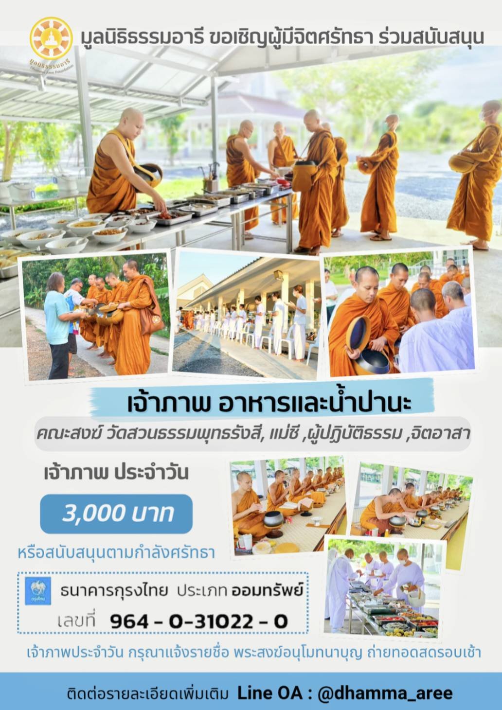 ประสงค์สนับสนุนเป็นเจ้าภาพอาหารแจ้งรายชื่อ เพื่อให้คณะสงฆ์กล่าวอนุโมทนาทานประจำวันได้ที่ไลน์แอด